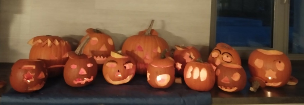 Mehr als 20 Personen waren beim Kürbisschnitzen am Donnerstag, den 30. Oktober 2025 in unserem Gemeinschaftsraum in Aktion. Mit viel kreativem Einsatz der Kürbis-Schnitzer im Alter von 3 bis 80 Jahren entstanden wunderschöne gruselige Kürbisgesichter. Halloween kann kommen!